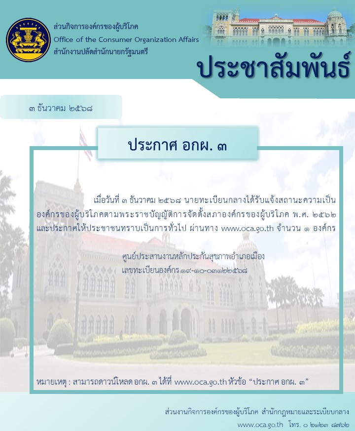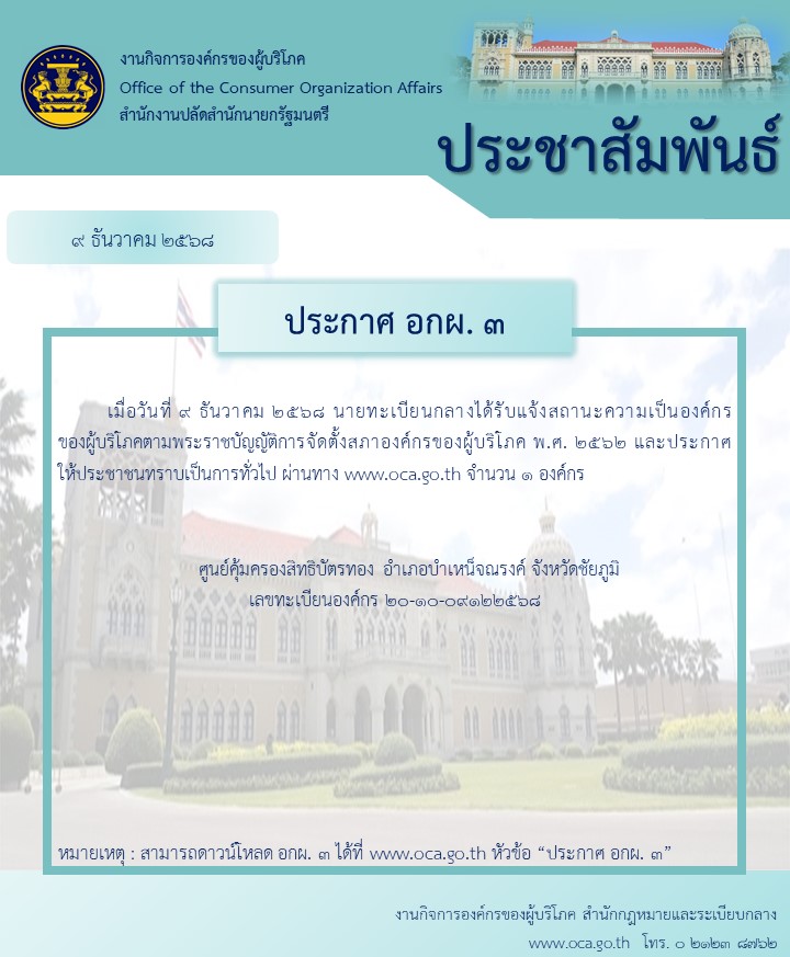 ประชาสัมพันธ์การประกาศ อกผ. ๓ ให้แก่องค์กรของผู้บริโภค (ใหม่)
